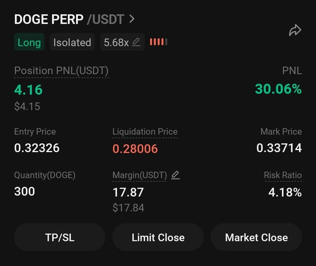 Example: Here is an image showing a live KuCoin futures position screen for DOGE-PERP/USDT (Long) during high-risk conditions: