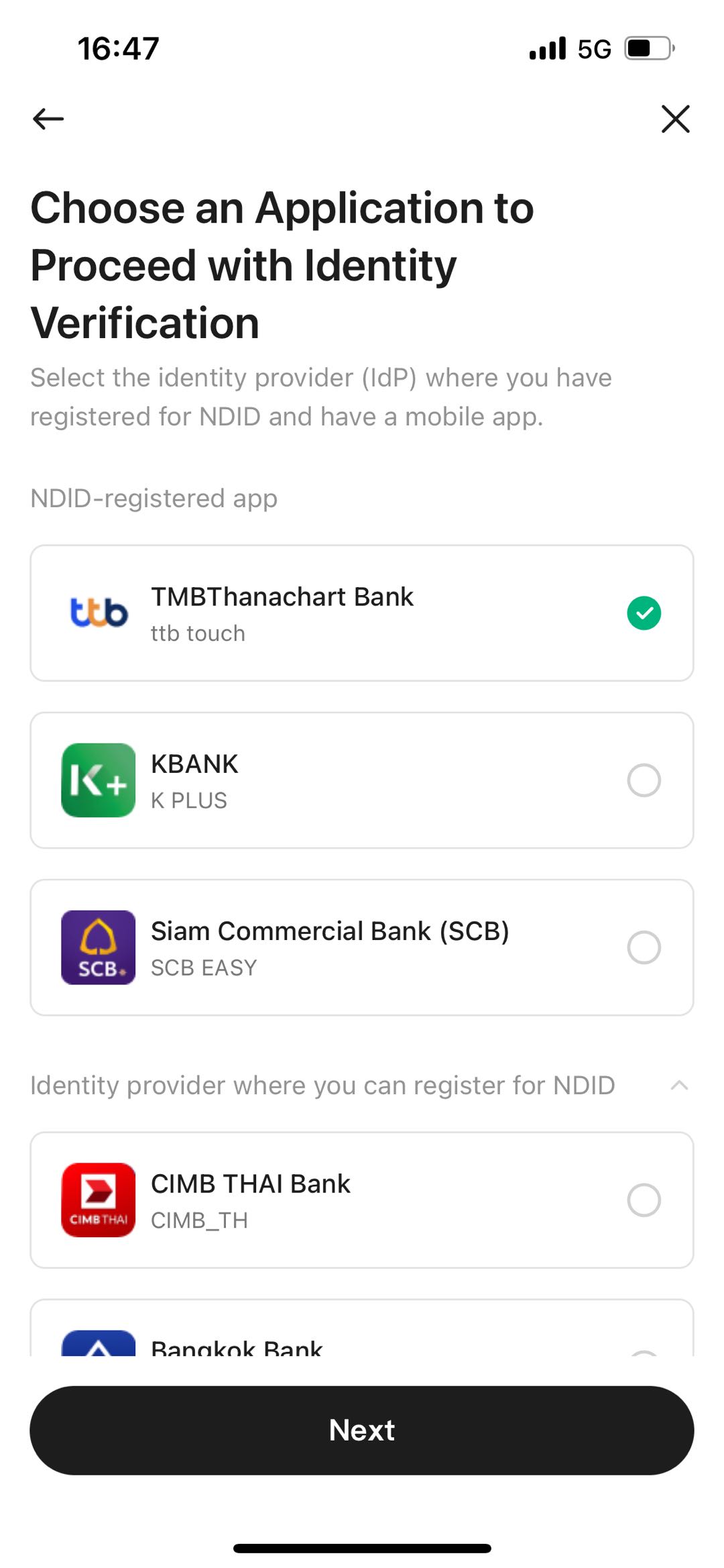 9.1 Select your bank that provides NDID services. After choosing the bank, click [Next]. You must complete the process within 60 minutes. Once the process is successfully completed, click [Confirm] to proceed.