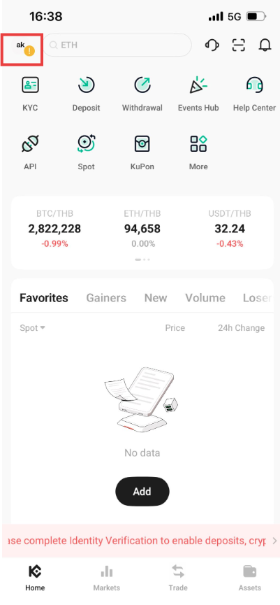 1. Log in to your KuCoin TH account and click [Profile] - [Identity Verification]