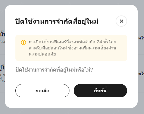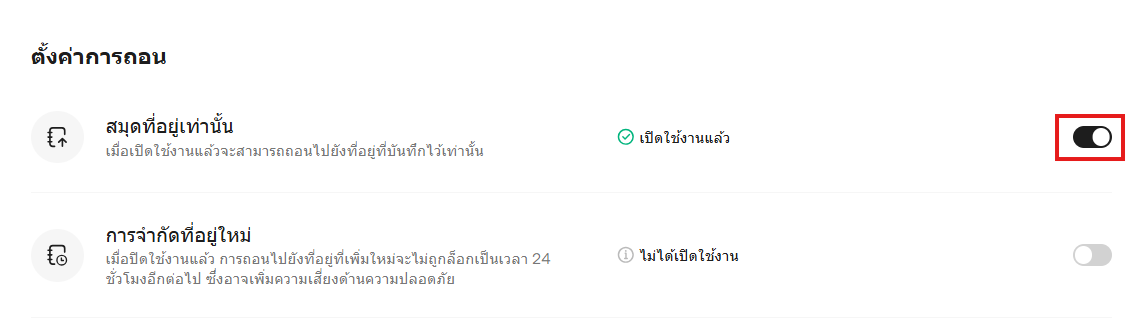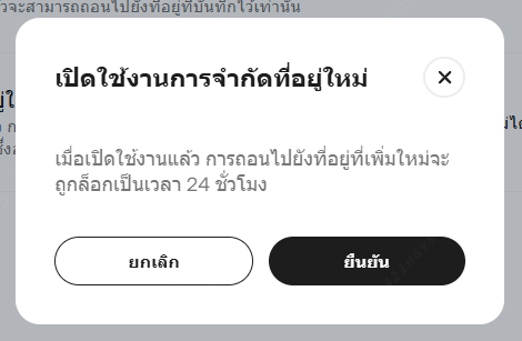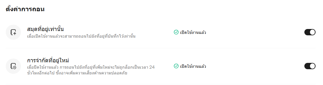 เมื่อเปิดการใช้งาน "การจำกัดที่อยู่ใหม่" การถอนสินทรัพย์ดิจิทัลจะถูกล็อกเป็นระยะเวลา 24 ชั่วโมง