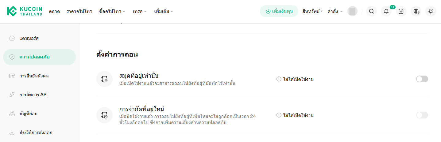 เข้าสู่ระบบ > ความปลอดภัย > ตั้งค่าการถอน > สมุดที่อยู่เท่านั้น